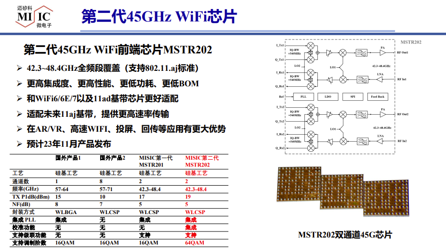 根据介绍,第二代45GHz WiFi前端芯片MSTR202实现了42.3~48.4GHz全频段覆盖,具备了更高集成度、更高性能、更低功耗、更低BOM的优势。能够和WiFi6/6E/7以及11ad基带芯片更好适配,还能适配未来11aj基带,在传输速率上有望能超过10Gbps。对AR/VR、高速WIFI、投屏、回传等应用有更大优势。