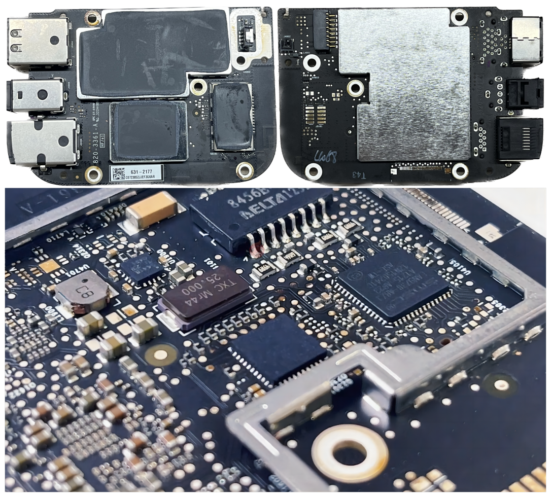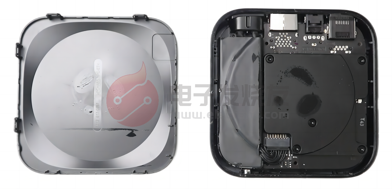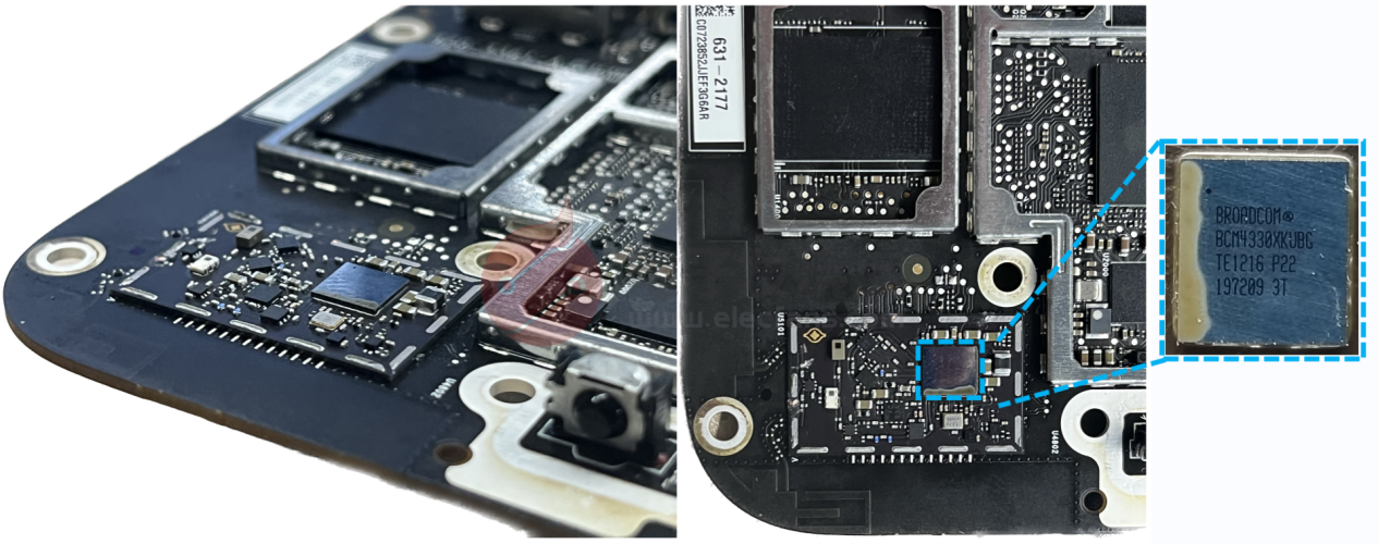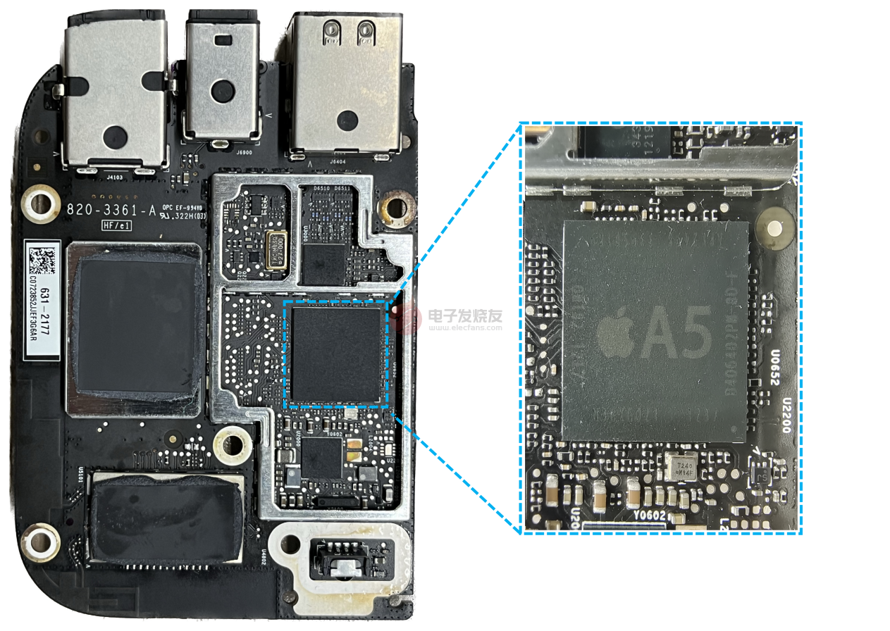 处理器芯片两侧各有一颗带有苹果logo的定制化芯片,具体功能未知。据笔者推断,这两颗芯片可能与视频编解码和HDMI信号输出有关。