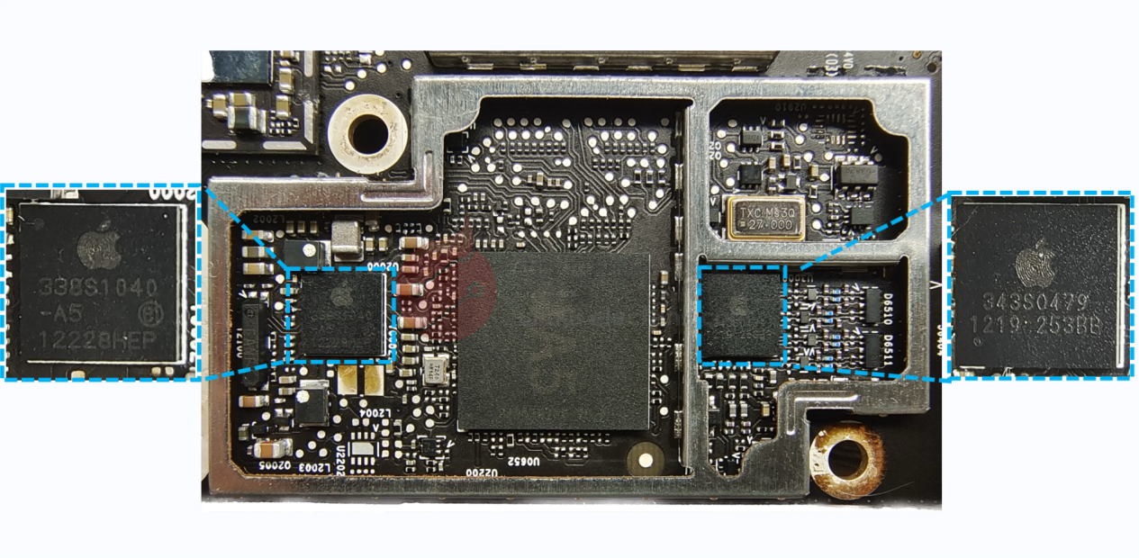 在做工细节上,苹果一直以来都保持着高标准的要求,电路板的做工也不例外。为了在有限的空间内实现更多的功能,苹果采用了众多小型封装器件,并将每个功能单元的外围电路井井有条的设计在芯片周围。