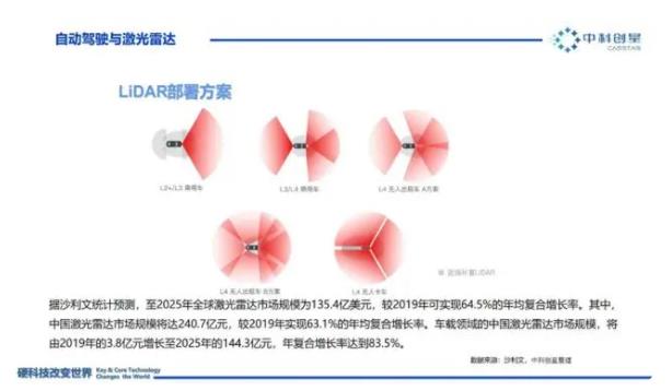车载摄像头:目前在L2级别的自动驾驶中主要应用于倒车监控、全景泊车辅助、盲点检测、自适应巡航、前方碰撞预警、车道偏离告警、交通信号及标志牌识别等场景。据ICVTank预测,2025年全球车载摄像头市场规模将达到273亿美元,2015~2025年 10年CAGR为16.0%。其中,国内市场预计2025年将达到237亿元,年复合增速32.7%。