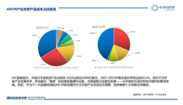 据IDC数据显示,中国元宇宙相关IT支出将在 2025达到近2000亿美元,2021~2025年复合增长率将达到20.2%。而对于元宇宙产业发展来讲,影响最为“直接”的因素就是硬件设备,尤其是显示设备的发展——元宇宙的沉浸式特性对硬件的要求极高。据此,作为下一代智能终端的AR/VR的发展对于元宇宙产业来说至关重要,而两者都十分依赖光学模组,这一点,可以从AR和VR的光学成本占比中看到。