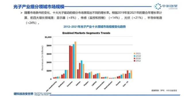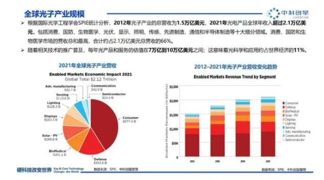 光子产业是一个快速发展的行业。自20世纪80年代始,世界各国便在光子产业投入了大量精力,截至2021年,全球光电产品总规模已经超过2.1万亿美元。随着“消费光子”时代的到来,将带来超过10万亿美金的巨大市场。