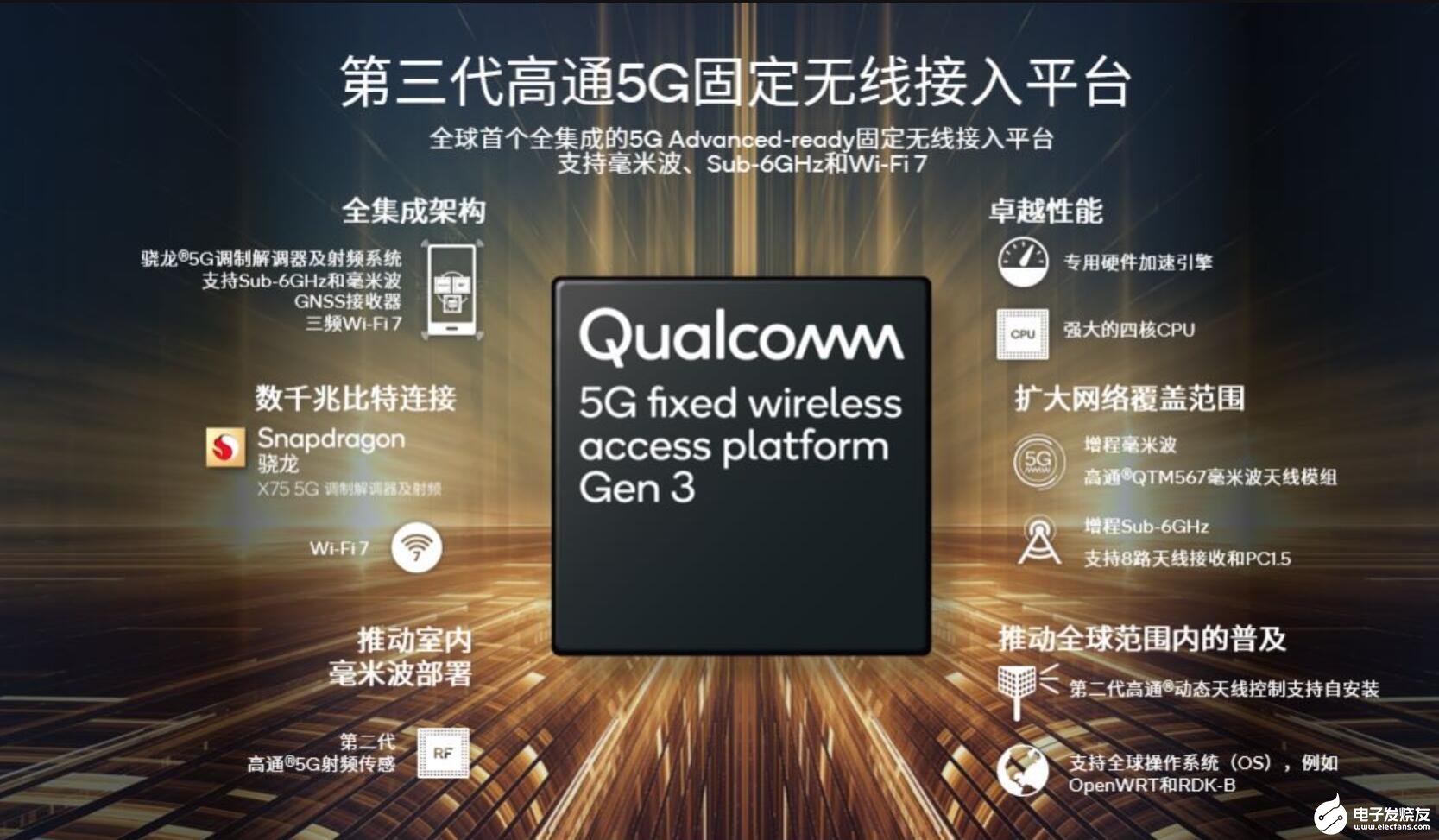 为了加速5G与工业、智能家居、车联网、元宇宙等垂直场景的融合,怎样把千兆比特的5G的传输速率赋能更多的场景终端。高通推出了搭载骁龙X75的第三代固定无线接入平台。这个平台是全球首个全集成的5G Advanced-ready固定无线接入平台,不仅支持毫米波、Sub-6GHz,还支持Wi-Fi 7以及10Gb的以太网能力。