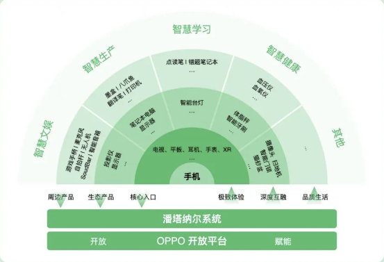 OPPO IoT生态布局围绕智慧文娱、智慧生产、智慧学习、智慧健康四大智慧场景,以自研入口级终端产品为核心,与垂直品类及头部第三方品牌共创无缝智慧互融体验,基于AlOT平台扩充符合OPPO价值主张的生态选品,完成了OPPOloT生态多圈布局。
