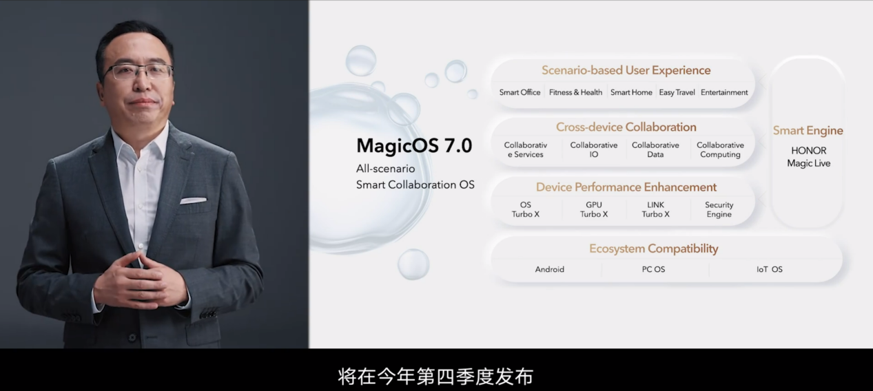 今年1月,荣耀发布Magic UI 6.0,在Magic Live智慧引擎加持下,升级Magic Live+基础OS和Magic Live+跨设备OS的智慧体验。今年Q4,荣耀将推出Magic OS 7.0,“该系统会与安卓其他操作系统高度兼容,不同操作系统的设备可以在系统层面,直接连接到支持Magic OS 的设备”,荣耀CEO赵明在柏林 IFA 2022 上表示,基于合作伙伴的开放平台,荣耀能够开发这些互联的体验,“Magic OS配备OSTurbo X、GPU Turbo X和Liink Turbo X可增强数据处理、图像和网络性能,同时还通过其他安全引擎提供了更高的安全性,通过将服务、I/O、数据和处理能力结合在一起”。