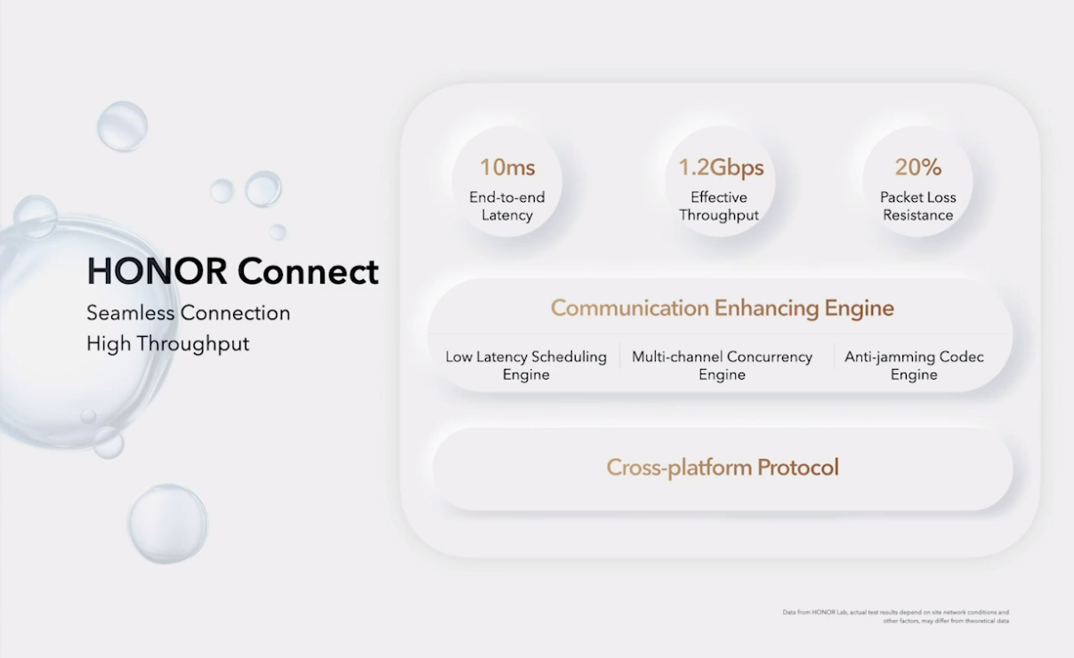 在MagicOS架构中HONOR Connect是其中重要的互联平台,“根据我们对开放和协作的承诺,我们跨平台协议使合作伙伴能够轻松地将其设备连接到MagicOS设备,”通过与行业合作伙伴之间的协同工作,HONOR Connect可以支持的连接端到端延迟低至10毫秒,具有每秒1.2兆位的有效吞吐量,即使在20%的数据包丢失网络环境中,也可以保持正常工作。