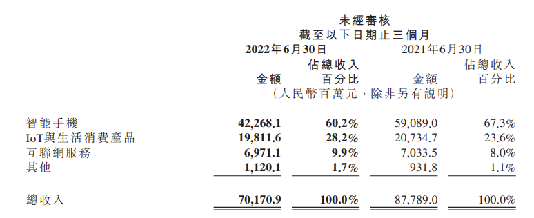 小米第二季度各业务营收情况