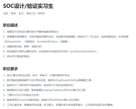 2021年业内传出字节跳动正在研发云端AI芯片和Arm服务器芯片,从此次招聘的实习生岗位中确实有相关的资质要求,例如SOC设计/验证实习生需要熟悉RISC-V或Arm V8系统架构,SoC系统开发/验证实习生还有需求熟悉x86体系架构的要求。在岗位学历要求方面,SOC设计&验证实习生需要硕士/博士研究生,SoC系统开发/验证实习生则是要求本科及以上学历在读。