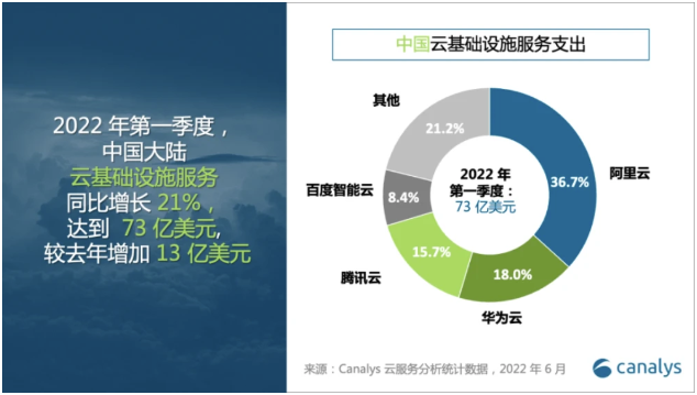 这或许后来者字节跳动是在追赶百度、腾讯、阿里这三大互联网巨头的步伐,早于字节跳动之前就开启自研芯片策略的BAT已经取得进展。Canalys数据显示,2022年第一季度,中国大陆云基础设施服务支出同比增长21%,达到73亿美元。阿里云排名第一,市场份额为36.7%;华为云排名第二,市场份额占比18.0%;腾讯云、百度智能云分别排名第三、第四,市场份额占比为15.7%、8.4%。云服务器业务的增长,让BAT站稳国内云服务器头部厂商的名号。