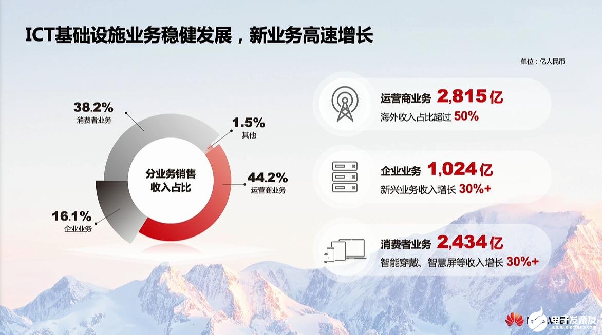 华为三大业务起头并进,运营商业务销售收入达到2815亿,海外收入占比超过50%,企业业务收入达到1024亿,其中新兴业务收入增长30%,比如说华为云数字能源增长是非常靓丽的,这两块业务的收入增长都已经超过了30%。