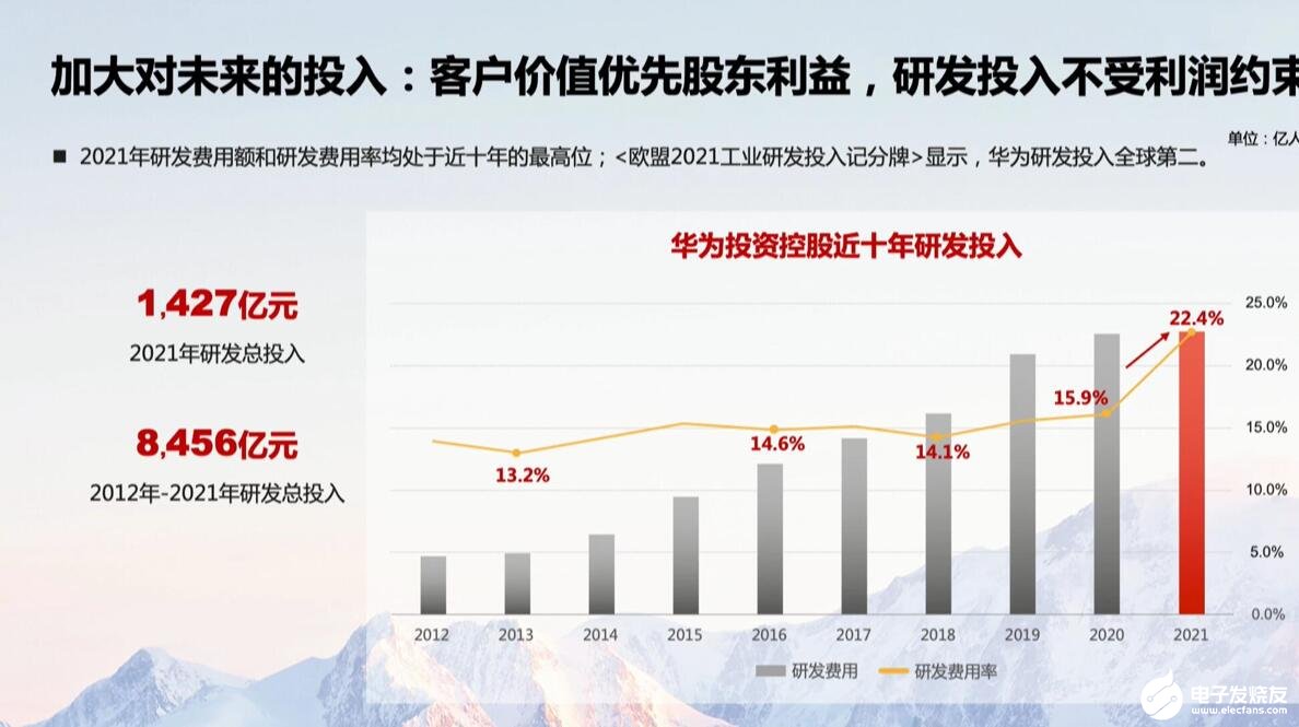 孟晚舟表示,对于华为而言,客户的价值优先于股东利益。华为公司真正的价值在于研发领域的投入,沉淀下来的能力、研发资产。我的报告最后,华为在2021年投入达到1427亿,2012年到2021年研发总投入达到8456亿元。2013年研发投入占收入13.2%,2021年研发投入占据营收的22.4%。根据欧盟2021年工业研发投入积分排行榜显示,华为的研发投入排名全球第二。