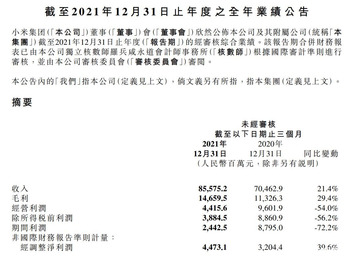 2021 年,小米集团总收入达到人民币 3,283 亿元,同比增长 33.5%;经调整净利润达到人民币 220 亿元,同比增长69.5%。