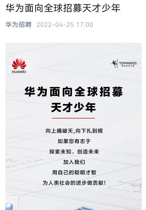 华为轮值董事长胡厚崑表示,华为招聘官网在4月25日放出对全球天才少年的招募,华为又一次面向全球召唤天才少年,录取条件不分国籍,不分专业,不分院校,要求为在数学、计算机、物理、材料、芯片、智能制造、化学等相关领域有特别建树并有志成为技术领军人物。只要你对未来有梦想,相信自己有能力,就可以来。