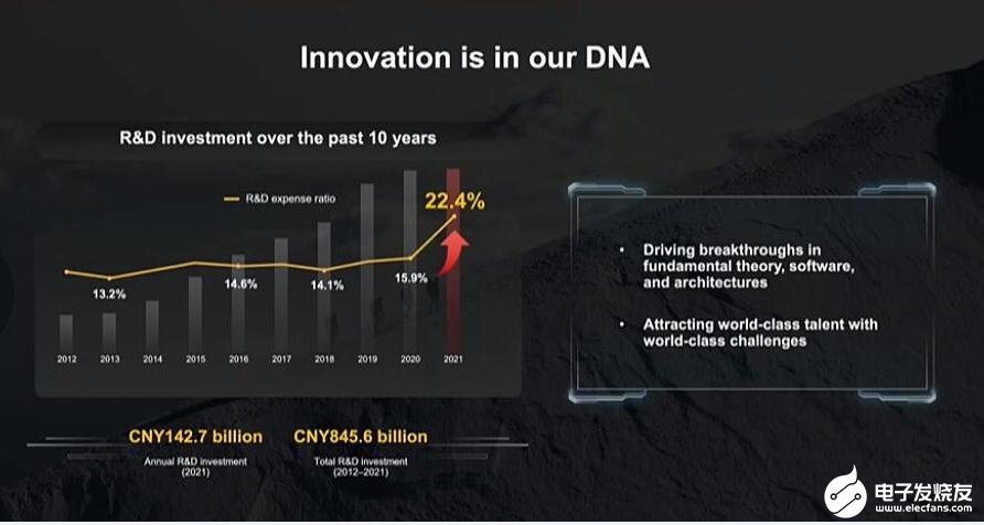 胡厚崑指出,华为在研发投入上持续攀升。2012年到2021年研发总投入达到8456亿元。2013年研发投入占收入13.2%,2021年研发投入占据营收的22.4%。华为近两年经营上遇到困难,但是对于创新投入一直持续增加。
