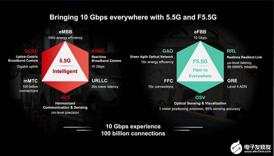连接无处不在,速率提升10倍“人类社会的发展对连接的需求是永无止境的,我们畅想一下未来,在未来的工业场景之下,工业控制对于实时性、可靠性的要求更高,华为大胆的想象了一下,未来我们需把现在的带宽、覆盖、时延提升10倍以上。” 胡厚崑指出,“华为定义了5.5G和F5.5G产业愿景,实现10Gbps无处不在。”