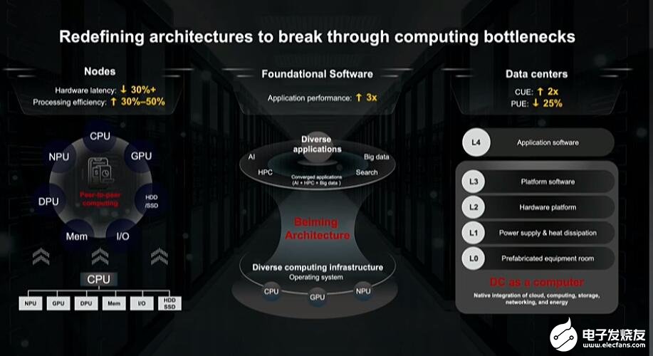 华为定义努力的三个方向,首先是节点层面,华为大胆提出全互联对等模式,用这个模式来突破现有以CPU为中心的异构计算架构,有可能遇到的性能瓶颈。