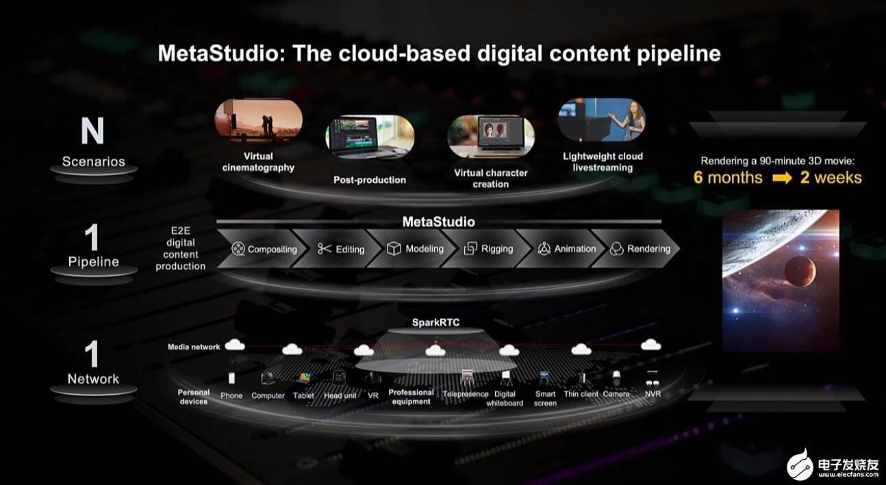 三、通过打造云上的数字内容生产线MetaStudio,以及构建以人为中心的全场景智慧化体验,加速物理世界和数字世界的融合。现在通过使用MetaStudio,充分调用华为云上百万核的渲染资源,就可以把过去一部90分钟的3D电影渲染时间,从6个月缩短到2周。