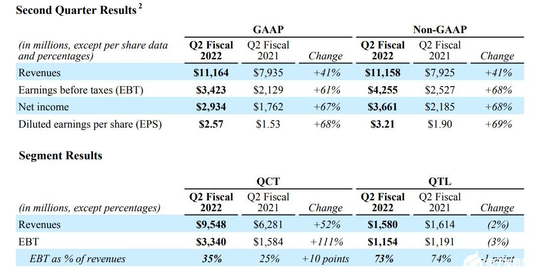 高通收入有四大部分组成,手机芯片是主要收入来源之一,也是高通芯片的最大市场,年增长 56% ,第二季度手机芯片营收达63.3 亿美元,这表明智能手机销售在通胀环境下的潜在放缓尚未影响到主要的安卓芯片制造商。
