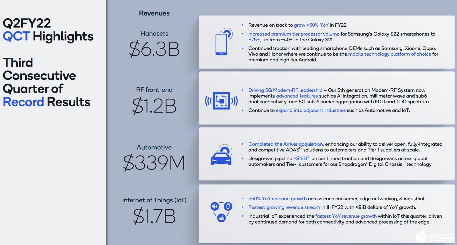 展望 2022 会计年度,高通预期,受惠于三星电子旗舰 Galaxy 系列与部分中国智能手机供货商旗下智慧手机业务将成长 50% 以上。