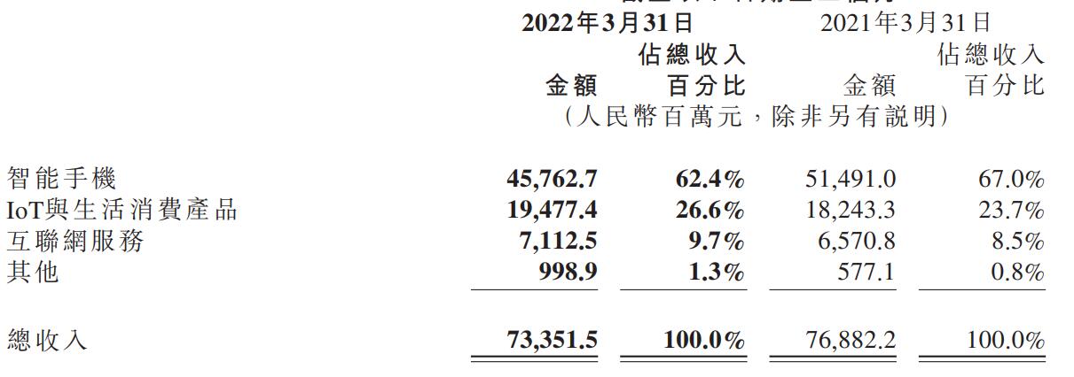 2022年第一季度,小米集团按照业务组成,四大业务呈现不同的表现。小米在财报中披露,2022年第一季智能手机业务收入达到458亿元,较去年同期的515亿元下滑11%;全球智能手机市场出货量为3850万台,较去年同期的4900万台下滑21.4%。财报传达的一个好消息是,小米智能手机单机价格达到1189元,同比增长14.1%。根据Canalys第一季度全球智能手机报告,小米位居第三。