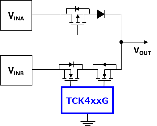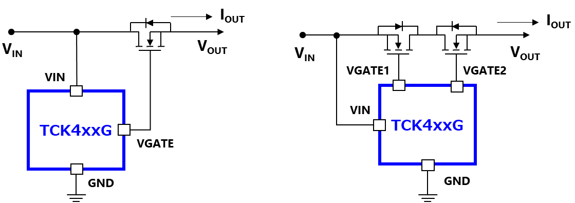 在新推出这五款产品后,TCK42xG系列现在允许用户从10V和5.6V这两种类型的栅源电压中进行选择,这覆盖了更多规格的MOSFET。凭借输入过电压锁定功能的多种检测电压,该产品能用于5V至24V的电源线路。如果与外部背对背MOSFET结合使用,它们也适用于配置具有反向电流阻断功能的负载开关电路(图1)或电源多路复用器电路(图2)。除此之外,其内置的电荷泵电路支持从2.7V至28V的宽输入电压范围,因此经过间歇操作,可在外部背对背MOSFET的栅极和源极之间提供稳定的电压---这种方式允许大电流的切换。