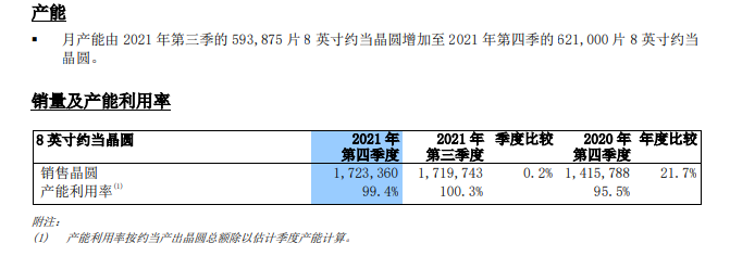 2021第四季中芯国际产能利用率为99.4%,相比第三季的100.3%有小幅下滑,但实际上的晶圆销售量是反而增加的。原因是在第四季度的扩产有所成效,中芯国际的月产能由 2021年第三季的593875片等效8英寸晶圆,增加至2021年第四季的621000片等效8英寸晶圆。