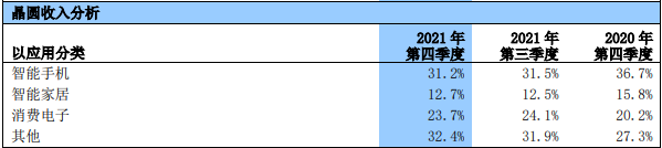 消费电子依然是前三大的单类应用来源,去年三四季度整体分布没有明显变化。不过其他业务相比去年同期有明显增长,其中包含汽车、工业等领域,汽车缺芯导致的芯片需求大概也在此被反映出来。