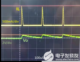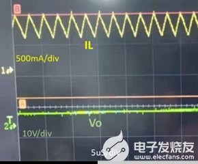 需要注意的是,当选择的调光方法或者调光电路要求输出短路时,此时会发生电路无法正常启动的现象。此时电感电流纹波变大,输出电压变得非常低,远远小于设定的电压。当这种故障发生时,电感电流将以最大的关断时间工作。通常芯片内部设置的最大关断时间达到200us~300us。此时电感电流和输出电压貌似进入了一种打嗝模式,无法正常输出。图3所示TPS92515-Q1 在负载采用分流电阻器的时候,电感电流和输出电压的异常波形。
