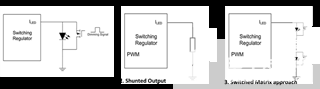 图4所示列举了三种可能引起以上故障的电路。当调光方式采用Shunt FET,负载选择分流电阻器,负载是LED开关矩阵电路的时候,都可能会使输出电压短路,而导致无法正常启动。