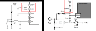 为了避免这种情况,即使输出短路的时候,仍需要一路额外的电压来给COFF进行充电。 VCC/VDD可以用作的并行电源为 COFF 电容充电,保持稳定的关断时间,并保持恒定的波纹。客户在设计电路的时候可以在VCC/VDD到COFF之间预留一个电阻ROFF2,如图5所示,有利于后期调试工作。与此同时,TI芯片的数据手册通常会根据芯片内部的电路给出具体的ROFF2的计算公式来方便客户对电阻的选择。