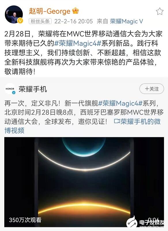 2月16日,荣耀总裁赵明在微博上官宣荣耀将会在MWC22上给业界带来荣耀Magic4系列新品。