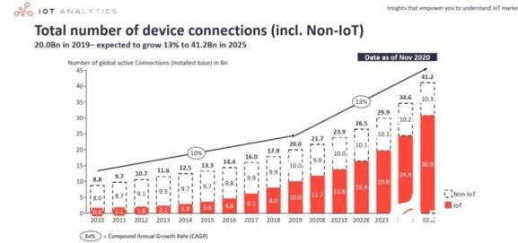 在蜂窝领域,基于5G技术快速发展以及2G、3G退网转向4G等趋势,新增加蜂窝类IoT设备需求高速增长。IoT Analytics发布的《2021年物联网展望》报告显示,2020年全球物联网连接数超过117亿个,首次超过非物联网连接数,并且在过去十年保持了30.8%的复合增长率。预计2025年全球将有超过300亿物联网连接。