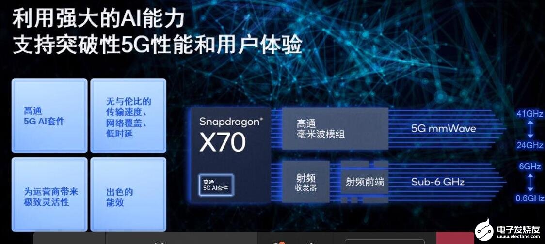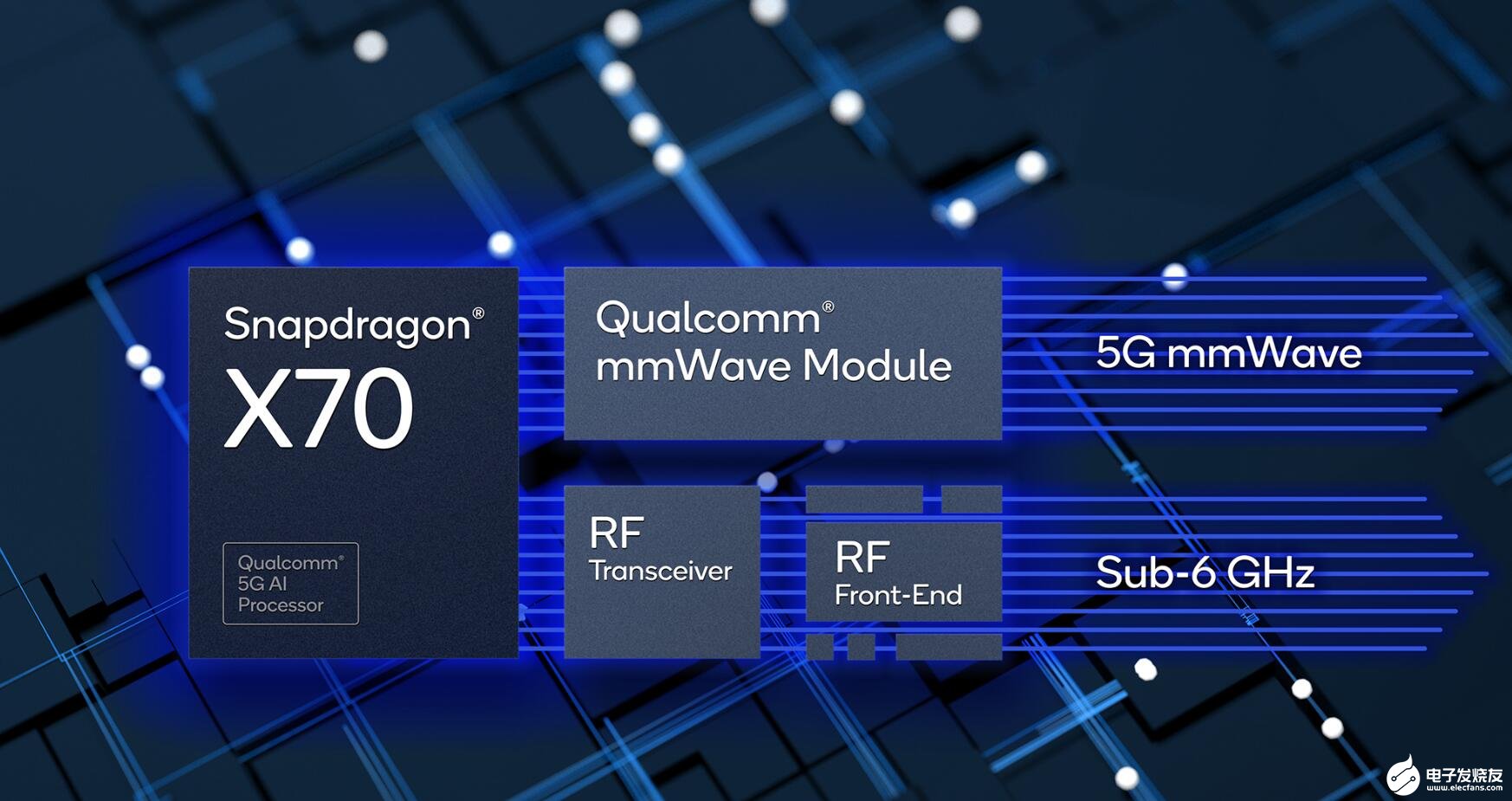 2月28日,高通在MWC22上发布了最新的第 5 代调制解调器到天线 5G 解决方案——骁龙 X70 5G 调制解调器及射频系统。骁龙 X70 在调制解调器及射频系统中引入全球首个 5G AI 处理器,利用 AI 能力实现突破性的 5G 性能,包括 10Gbps 5G 下载速度、令人惊叹的上传速度、低时延、卓越的网络覆盖和能效。