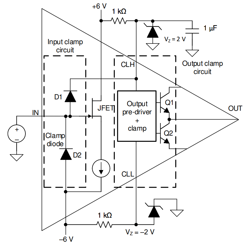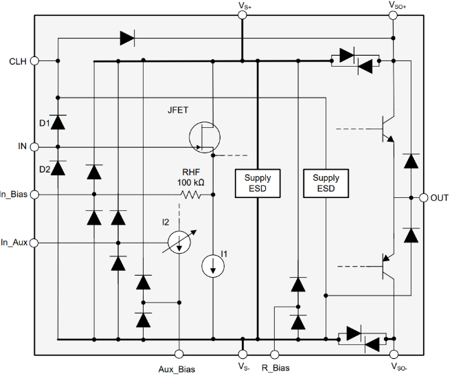 ESD对于放大电路的损害主要从结构和二极管上来解决,如下图。图中的D1和D2二极管能够承受100 mA的连续电流,从而使电路设计人员能够保护IN引脚免受任何ESD冲击以及高压瞬变的影响。