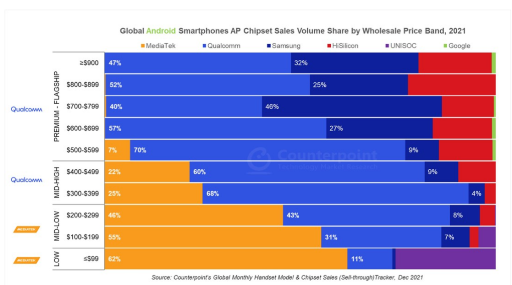 2021年,高通继续以 65% 的份额在中高端(300-499 美元)智能手机市场占据主导地位,高于 2020 年的 53%。骁龙 870、720G、750G 和 778G 是高通在这个区间的主要产品。在高端SoC芯片市场,高通持续推出了旗舰产品骁龙888 和 8Gen 1,高通在价格高于 500 美元的智能手机中的份额从2020 年的 41% 增加到 2021年的55% 。