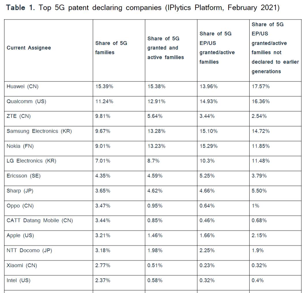 图1:2021年2月全球5G专利前14名公司排序。来自IPlytics网站