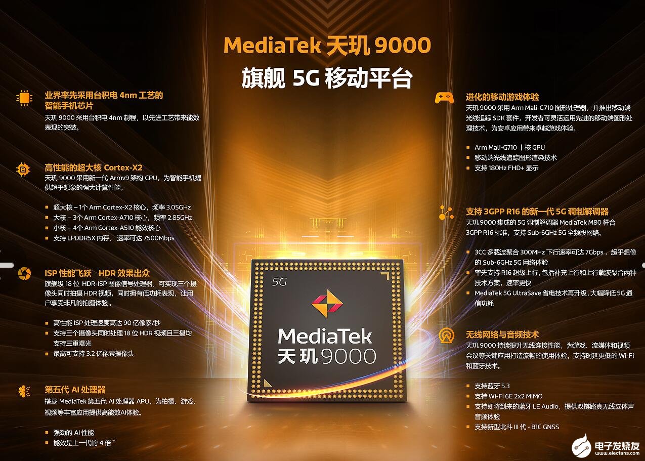 在GPU方面,天玑9000首发了Mali-G710十核GPU,相比上代的Mali-G78提升30%,功耗降低了35%。支持光线追踪,比目前的安卓旗舰产品图形处理效率提升35%,能耗比提升60%。值得注意的,苏黎世联邦理工学院的AI Benchmark V4测试中,天玑9000的AI性能比姑姑最新推出的集成edge TPU单元的Tensor处理器的AI性能高除了16%。在图像信号处理上(ISP),天玑9000内建联发科最新的ISP产品Imagiq Gen7,最高可以支持3.2亿像素,并且首发实现3颗镜头同时拍摄HDR影片,同时处理18Bit HDR视频,且三摄均支持三重曝光。