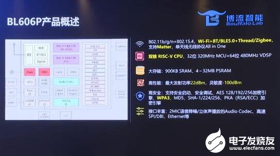 博流智能现场发布了首款多模无线语音SoC芯片BL606P。这款芯片的主要特征是多种集成和多连接。多连接是指该芯片集成Wi-Fi、BT双模、Zigbee、Thread等多模无线协议,是业界第一款单天线四模无线协议高集成度的芯片,它还支持Matter协议;该芯片除了集成多模无线协议外,还集成了音频codec、DSP等AI语音处理相关硬件以及支持彩屏显示,可以实现麦克风矩阵远场语音交互。刘占领强调说:“BL606P芯片采用双RISC-V核架构,32位320MHzMCU+64位480MHzVDSP,最大发射功率22dBm,灵敏度-100dBm,行业内主流的芯片发射功率大约17-19dBm,我们的芯片比别人的芯片可以多穿透一堵墙。高安全性,而且接口丰富。”