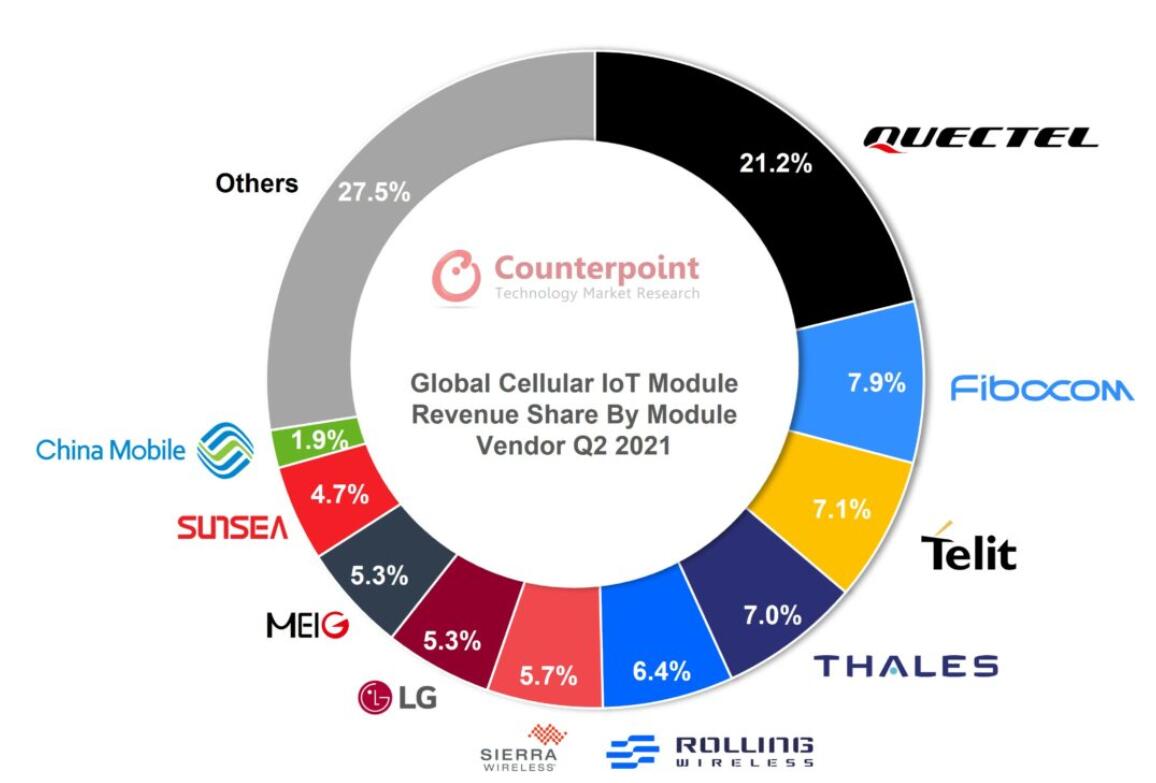 图: 2021 年第二季度模组供应商的全球蜂窝物联网模组收入、份额