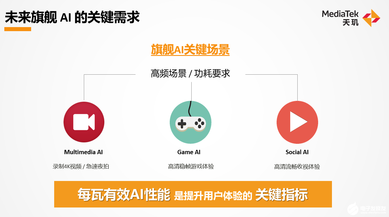 MediaTek 分享了旗舰移动平台在AI方面的趋势和挑战,并表示:在拍照、视频、流媒体、游戏等高频应用场景中,相比峰值AI算力,每瓦有效AI性能才是确保并提升用户长时间稳定体验的关键指标。