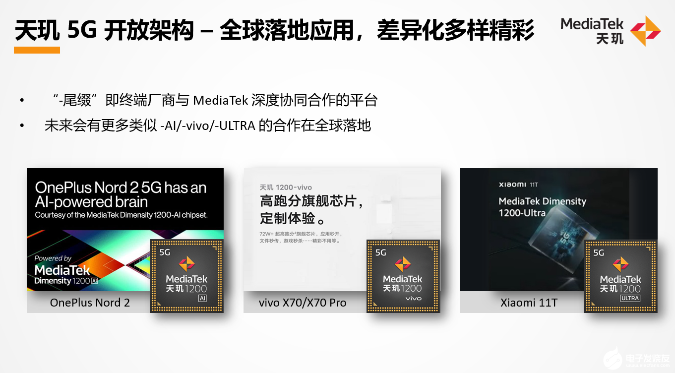 以天玑1200移动平台为基础,MediaTek与一加、小米、vivo、realme等终端厂商深度协同合作,通过天玑5G开放架构共同打造了天玑1200-AI、天玑1200-Ultra、天玑1200-vivo等平台,充分释放旗舰潜能,赋能终端打造差异化的高端5G智能手机体验。