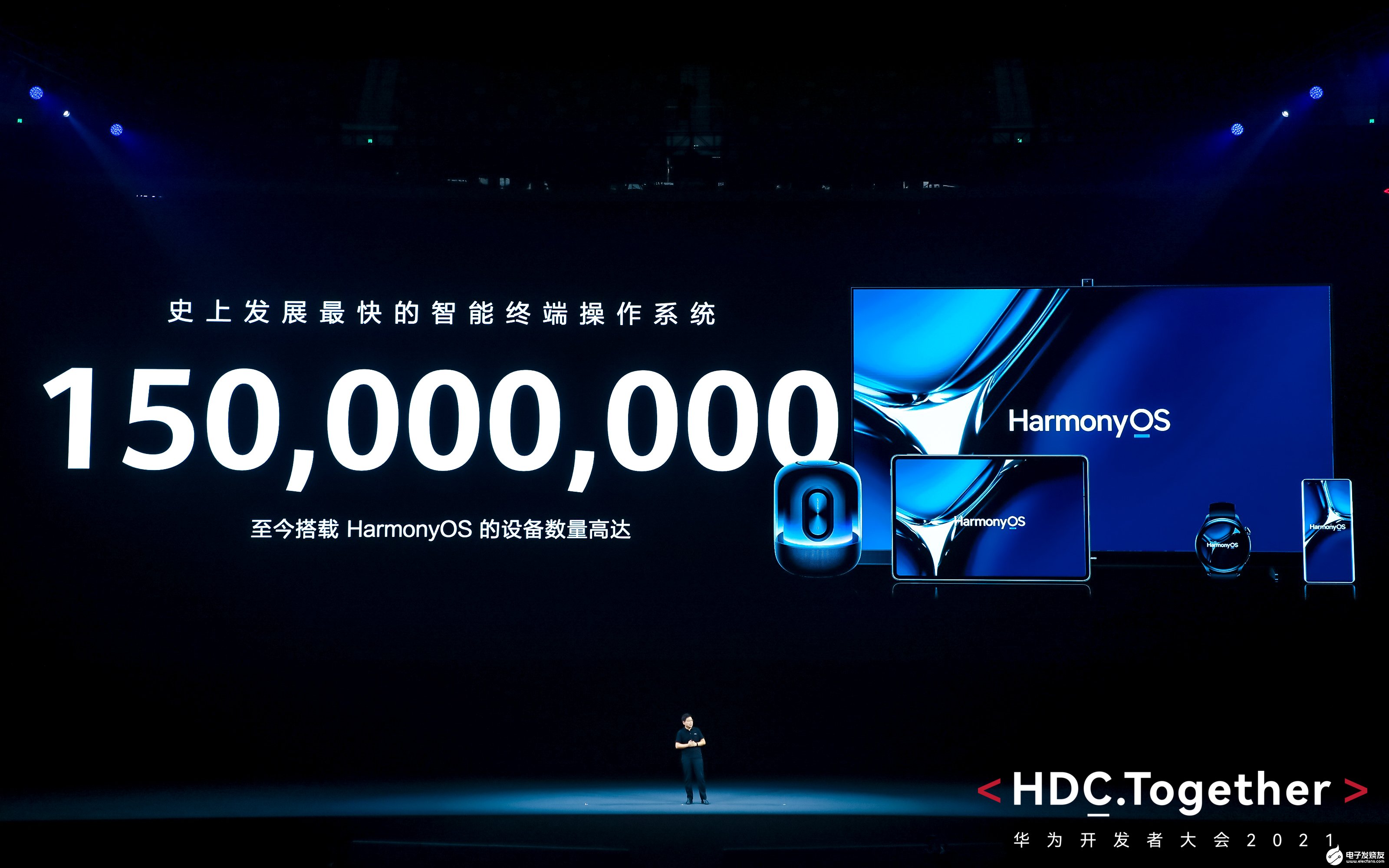 2021年10月22日下午,在东莞松山湖举办的华为开发者大会2021上,华为常务董事、消费者业务CEO、智能汽车解决方案BU CEO余承东在华为开发者大会上宣布,HarmonyOS成为史上发展最快的智能终端操作系统。