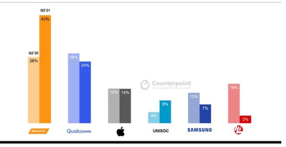 (电子发烧友网报道 文/章鹰)5G手机出货量今年持续增加,5G手机芯片市场竞争也相当焦灼。根据调研机构Countpoint对2021年第二季度的数据显示,2021年第二季度,5G智能手机出货量同比增长近四倍,同时带动了全球智能手机AP/SoC芯片组的发展,其出货量同比增长31%。