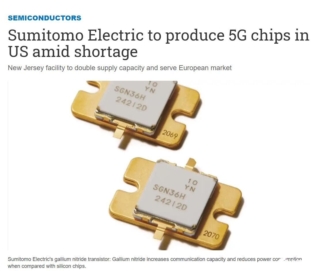 7月4日,据《日经新闻》报道称,日本芯片制造商住友电工将从9 月起为美国5G基站生产半导体。住友电工在美国新泽西州的一家工厂,生产用于 5G 基站的半导体。此前,住友电工将其大部分的5G基站半导体销售给中国华为公司。