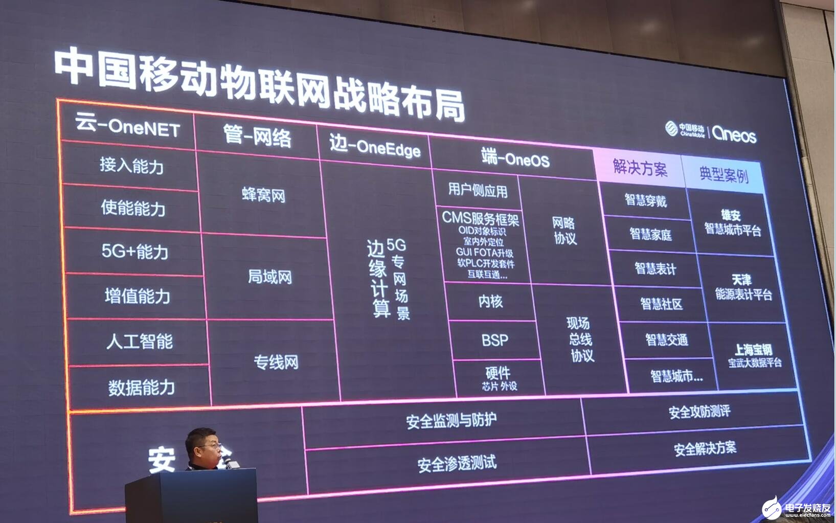经过近年来的积累,中国移动已经形成了以5G物联网中台为核心的一套云管边端的全面的一个能力布局。在端侧,中移物联网提供低成本的国产芯片、通讯模组,还有各种行业的网络终端;在边缘侧,中国移动主要面向5G的专网场景,打造了一套“连接+计算+应用”的一体化的边缘计算能力。中国移动物联网战略布局包括三大部分:One link连接管理平台,业务使能平台OneNET,边缘服务One Edge,端平台OneOS,还有专门为5G打造的运营平台One Simple。