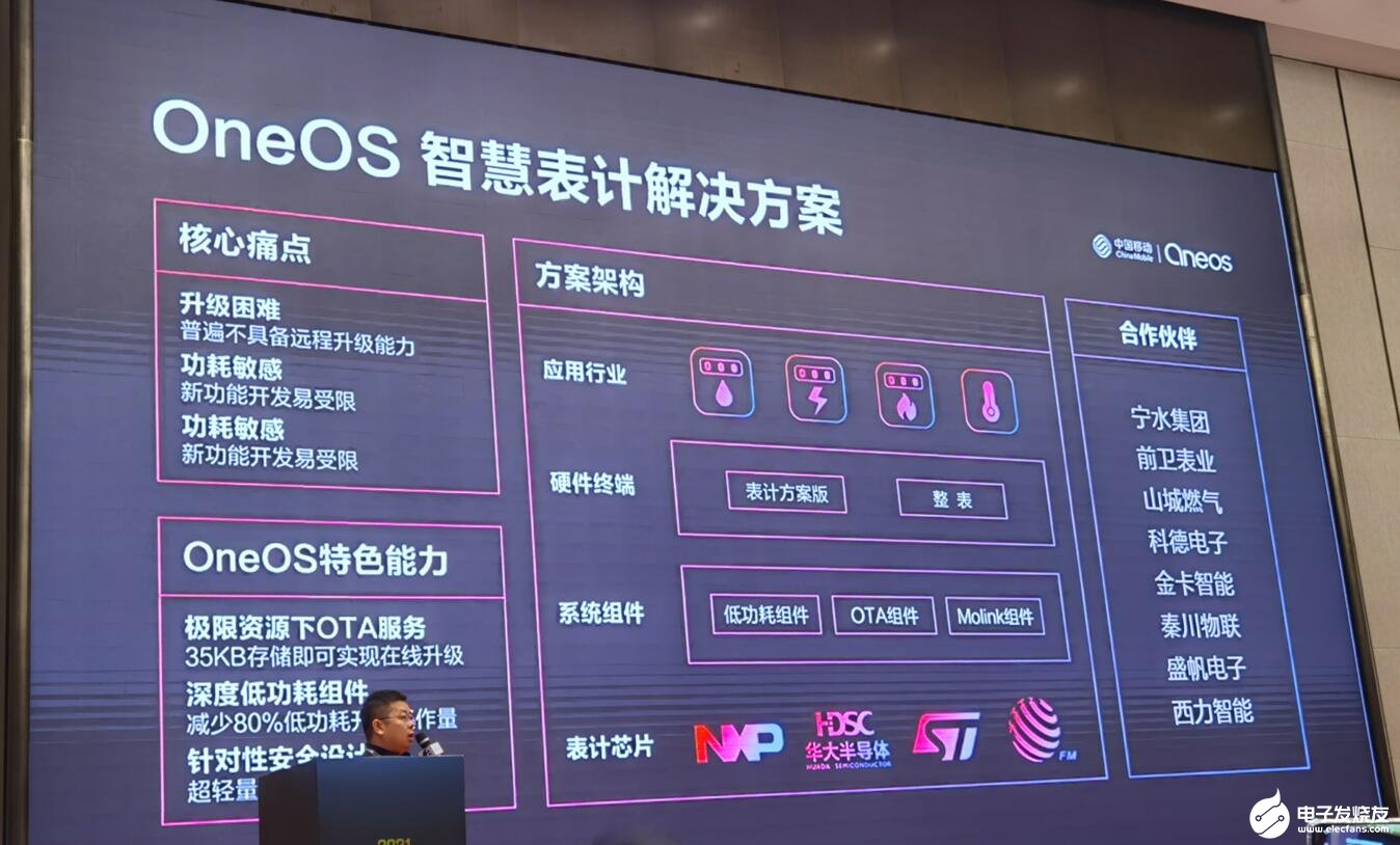 目前中移物联网OneOS 1.0版本推出,主要在智慧城市、智能表计、智慧家庭、智能可穿戴领域进行了规模化应用。“表计客户的特点:一是资源比较少,需要在极限芯片资源下实现一些需求;二是功耗要求低,电池耗电少,要求它的设备在网运行6年甚至10年以上。三、OTA升级包括一些安全诉求。针对表计客户的特殊需求,中移物联网联合芯片供应商,包括ST、华大半导体,深度融合推出一套轻量级内核,加上低功耗的框架,这套框架可以帮助表计客户减少80%的低功耗的工作,加上极限资源下的分级服务,以及我们在电池管理方面的一些能力和算法,中移物联网推出了一整套针对表记行业用户的能力解决方案。” 孙靖表示。
