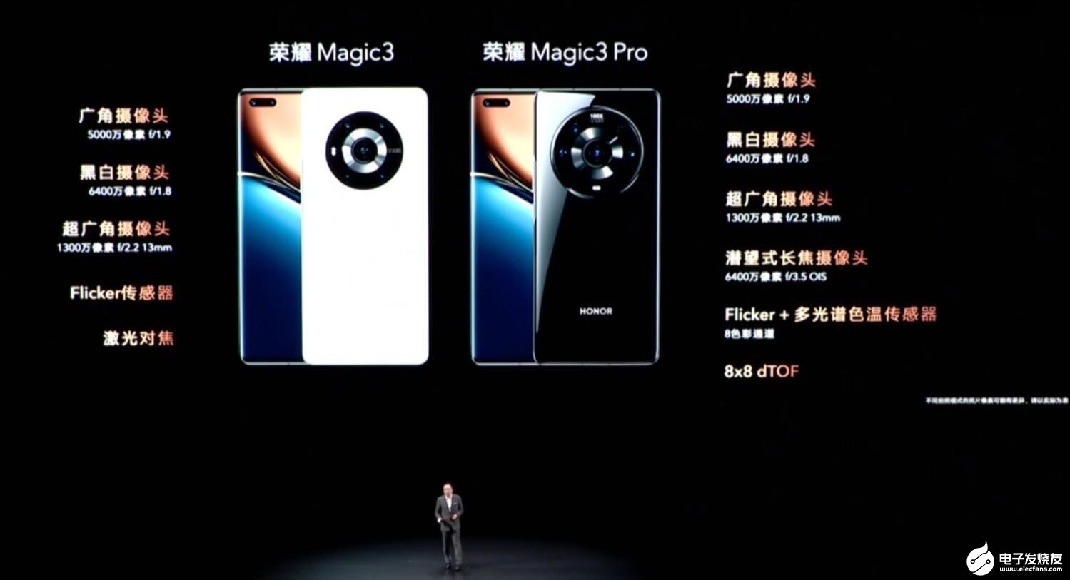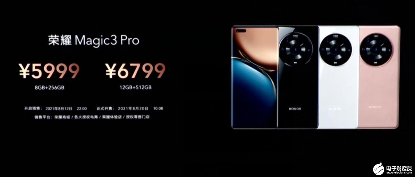 荣耀Magic3 Pro:8GB+256GB 5999元、12GB+512GB 6799元。亮黑色、釉白色、晨晖金三种配色可选。