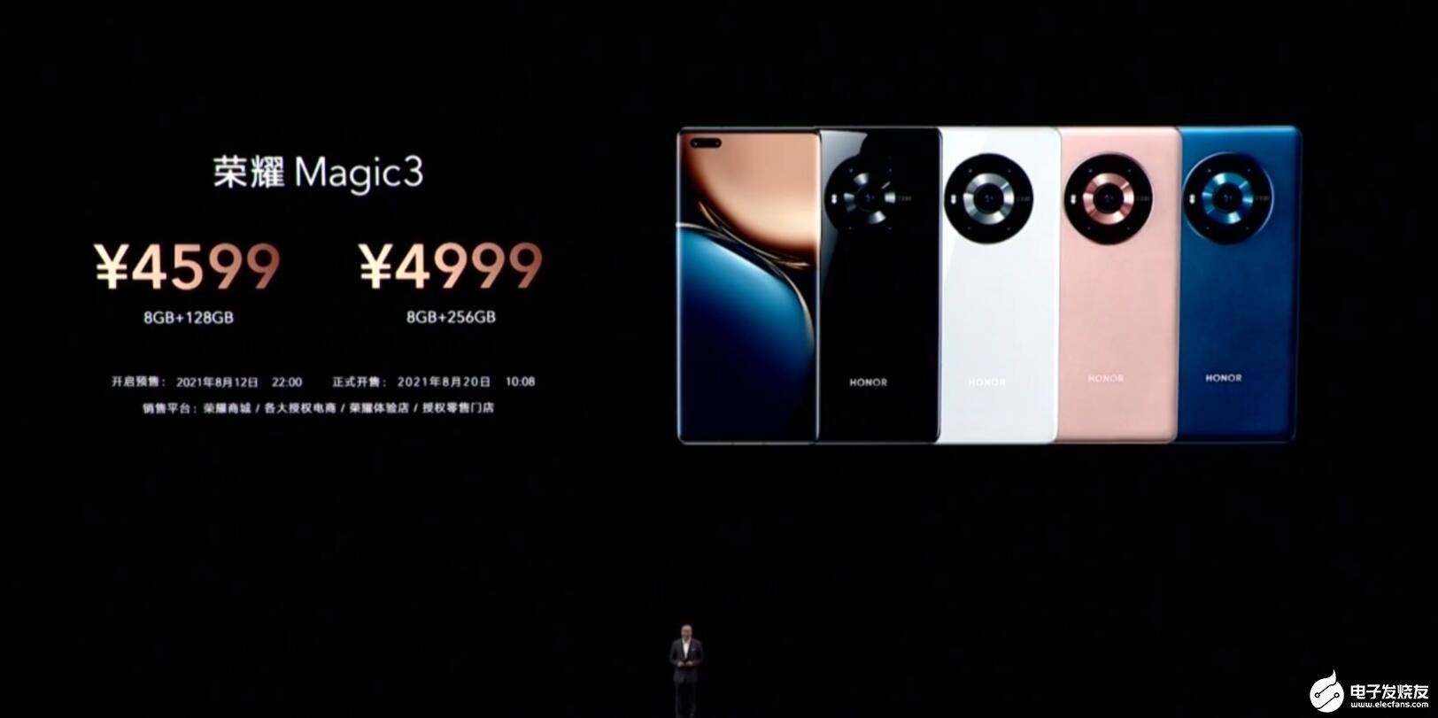 荣耀Magic3:8GB+128GB 4599元、8GB+256GB 4999元。有四种配色可以选择:亮黑色、釉白色、曙光蓝、晨晖金。