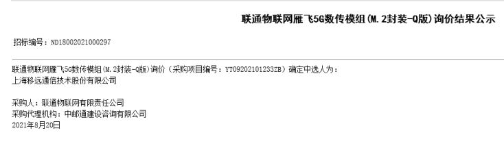 8月20日,中国联通发布了雁飞5G定制数传模组(M.2封装-Q版)询价结果公示,移远通信独家中标。值得强调的是,本次中标的是移远通信专门为雁飞5G设计的一款5G Sub-6GHz模组,对中国联通频段做了定制优化,支持5G SA模式,还对上下行速率进行了针对性的调整,在实现物尽其用的同时还可大幅度降低5G应用部署成本。