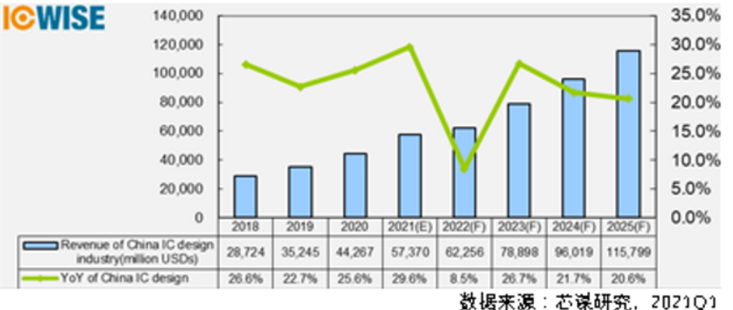 芯谋研究每年推出的《中国芯片设计产业年度报告》已经持续跟踪中国集成电路产业15年以上。刚刚推出的2020年报告指出,2020年中国芯片设计产业产值达到442亿美元,到2025年,这一数字将超过1000亿美元,年复合增长率(CAGR)超过20%。